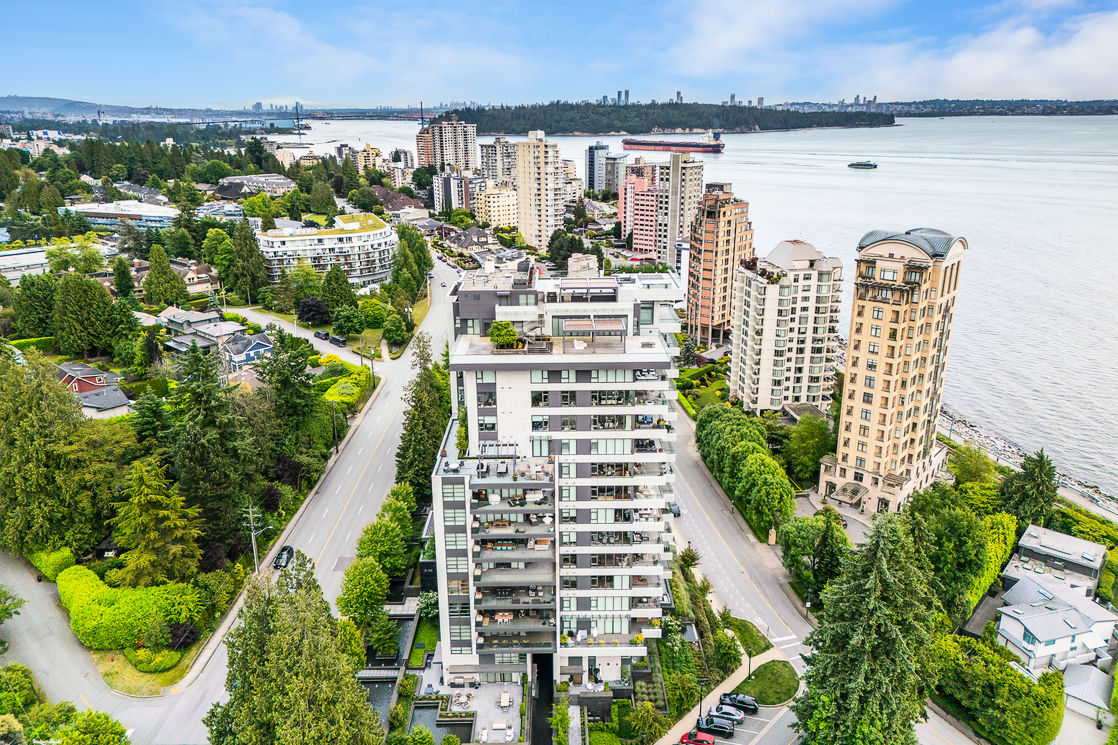 THE BELLEVUE by Cressey— This prestigious southwest corner residence features 2084 sq ft of indoor sophisticated living space with breathtaking ocean views and stunning sunsets. The open-concept layout and seamless indoor/outdoor flow lead to an oversized patio with three built-in heaters & BBQ for year-round enjoyment. The luxurious primary bedroom features a walk-in closet and spa inspired ensuite, generous 2nd bedroom, den & laundry room. Top-of-the-line finishes include dual Sub-Zero wine fridges, a built-in espresso machine, 10-ft ceilings, A/C, and a private triple-car garage. Exclusive amenities include an indoor pool, steam room, sauna, fitness center, and concierge services—elegant life-style living at its finest! Steps to seawall & Dundarave Village.
